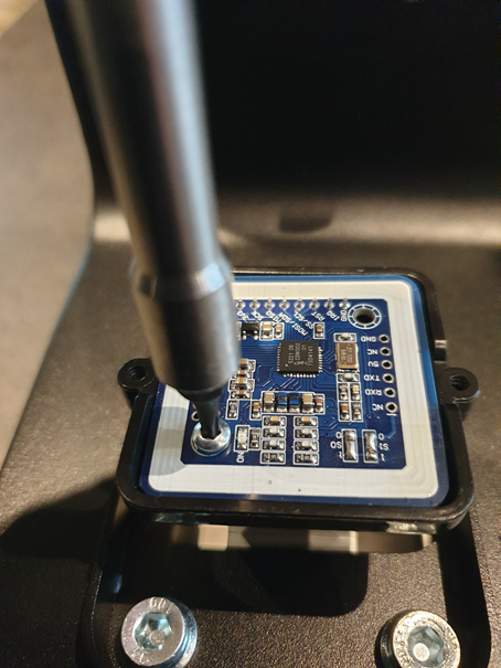 - Unscrew the screw of the RFID module with a Torx T10 screwdriver and remove the RFID module from the RFID holder by gently pulling on the connector from the cable, not by pulling the wire.