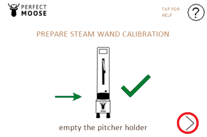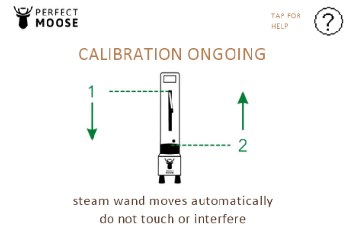 The steam wand will move automatically downwards until it touches the pitcher holder and back upwards. Do not touch or interfere the Moose during the steam wand calibration.